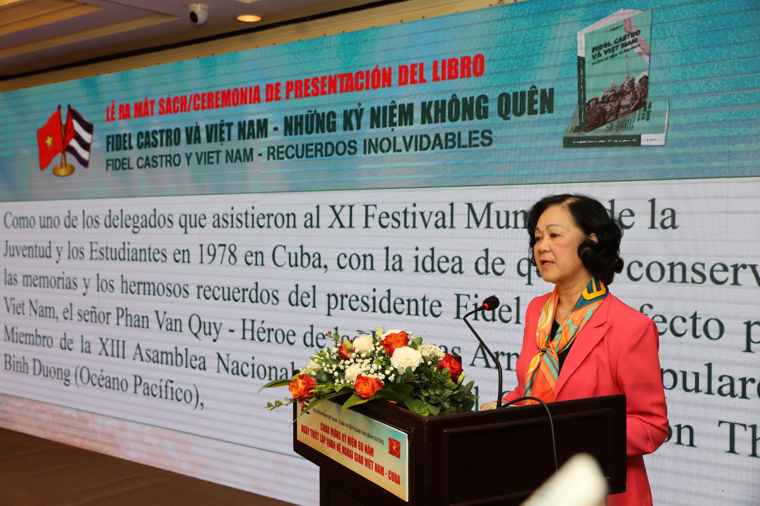 Phát biểu tại buổi lễ, bà Trương Thị Mai, Trưởng ban Dân vận Trung ương, Chủ tịch Hội hữu nghị Việt Nam – Cuba nhấn mạnh: cuốn sách “Fidel Castro và Việt Nam – Những kỷ niệm không quên” thực sự là mòn quà có ý nghĩa không chỉ đối với thế hệ trẻ Việt Nam mà còn là nguồn tư liệu quý giá cho các thế hệ trẻ Cuba hiểu rõ hơn về mối quan hệ hữu nghị đặc biệt trong lịch sử mà Đảng và nhân dân hai nước đã dày công vun đắp, giữ gìn, bảo vệ và để lại cho các thế hệ mai sau.
