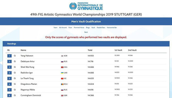 Giải thể dục dụng cụ vô địch thế giới 2019 đang diễn ra tại Stuttgart (Đức). Đội thể dục Việt Nam tham dự giải với 6 VĐV, 3 nam và 3 nữ do bà Nguyễn Kim Lan, vụ trưởng Vụ Thể thao thành tích cao I làm trưởng đoàn.