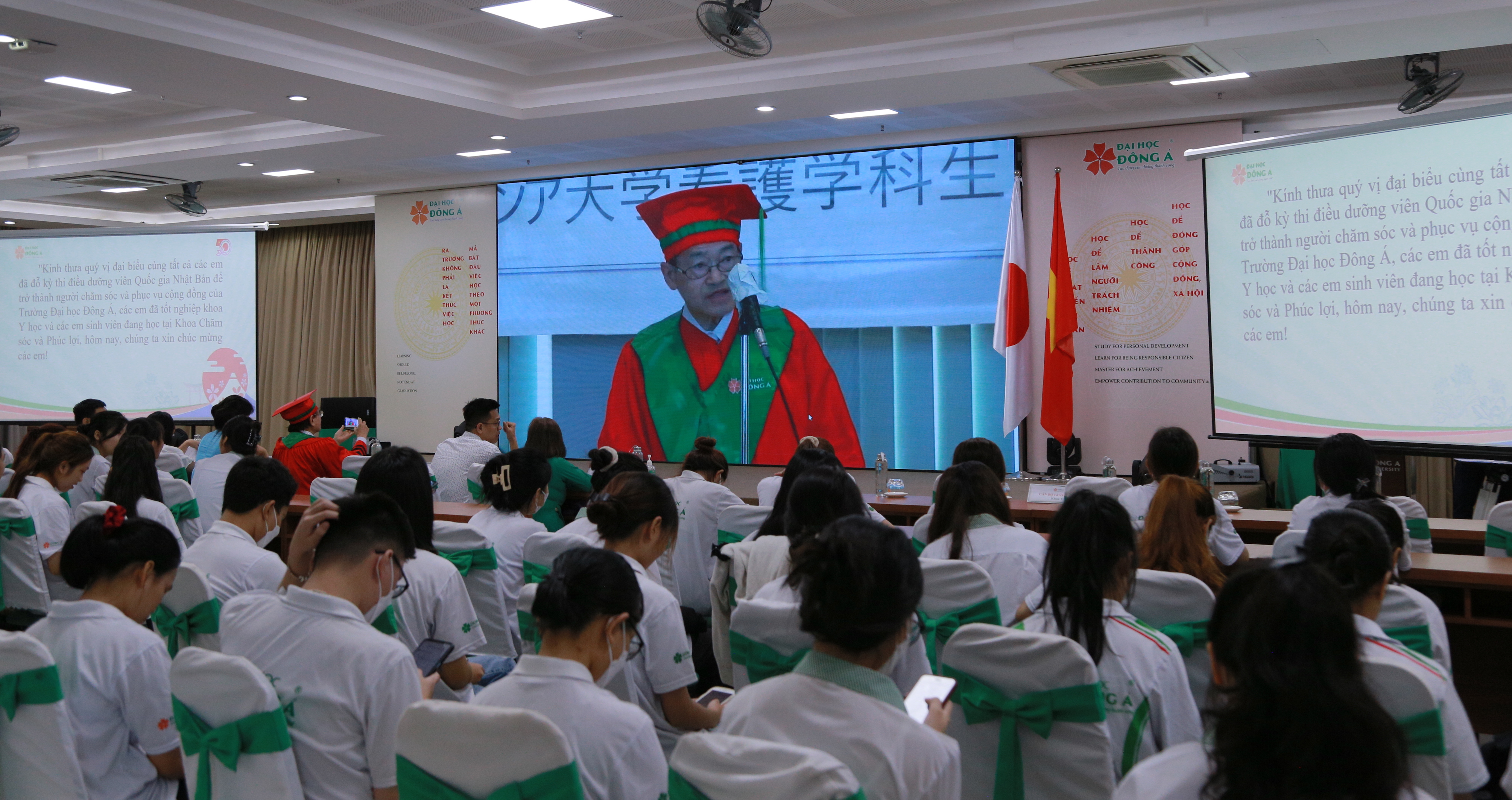 Buổi lễ được diễn ra theo hình thức trực tiếp và trực tuyến. Tại chương trình, Đại học Đông Á đã tuyên dương và khen thưởng 13 sinh viên Điều dưỡng đang làm việc tại hệ thống bệnh viện tổng hợp Kameda đã xuất sắc đỗ kỳ thi điều dưỡng viên quốc gia Nhật Bản chuyên ngành chăm sóc và phục hồi sức khỏe lần thứ 35. Cùng với năng lực chuyên môn điều dưỡng, các bạn cũng sở hữu kỹ năng Nhật ngữ đạt trình độ N2 trở lên để tiếp tục làm việc lâu dài tại hệ thống bệnh viện và cơ sở y tế tiên tiến của tập đoàn ở Nhật.