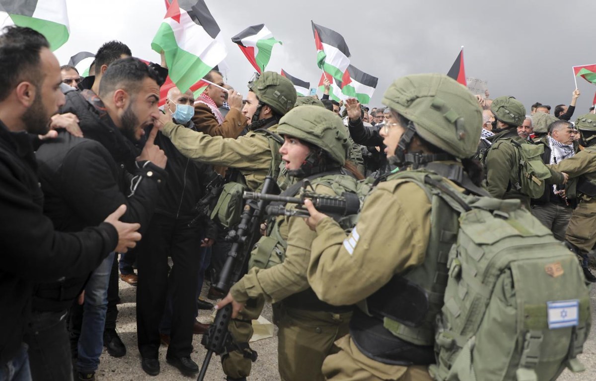 Người dân Palestine xung đột với binh sỹ Israel trong cuộc biểu tình tại Bờ Tây phản đối đề xuất hòa bình của Tổng thống Mỹ Donald Trump ngày 29/1/2020. (Ảnh: AFP)