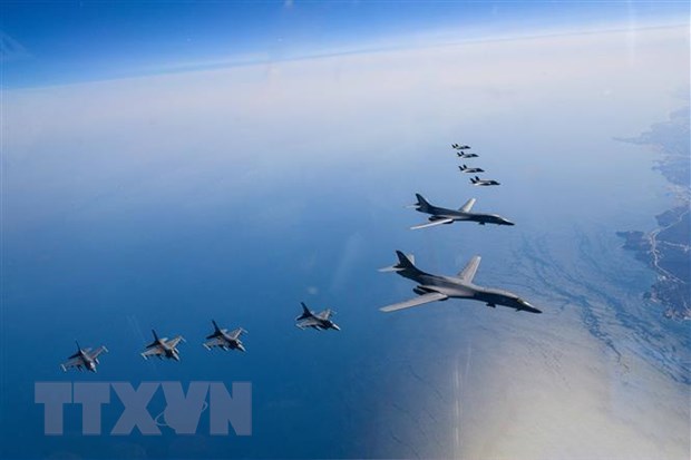 Máy bay ném bom chiến lược B-1B (phải) của Mỹ cùng chiến đấu cơ tàng hình F-35A (phải, trên) của Hàn Quốc và máy bay chiến đấu F-16 (dưới) của Mỹ tham gia cuộc tập trận chung trên bầu trời Bán đảo Triều Tiên ngày 19/3/2023. (Ảnh: AFP/TTXVN)