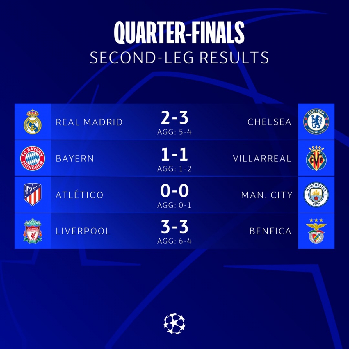 Rạng sáng nay (14/4) đã diễn ra 2 trận đấu lượt về vòng tứ kết Cúp C1 châu Âu 2021/2022. Đó là cuộc so tài của Liverpool với Benfica và Atletico Madrid với Man City. Đã không có bất ngờ nào xảy ra ở các loạt trận này.