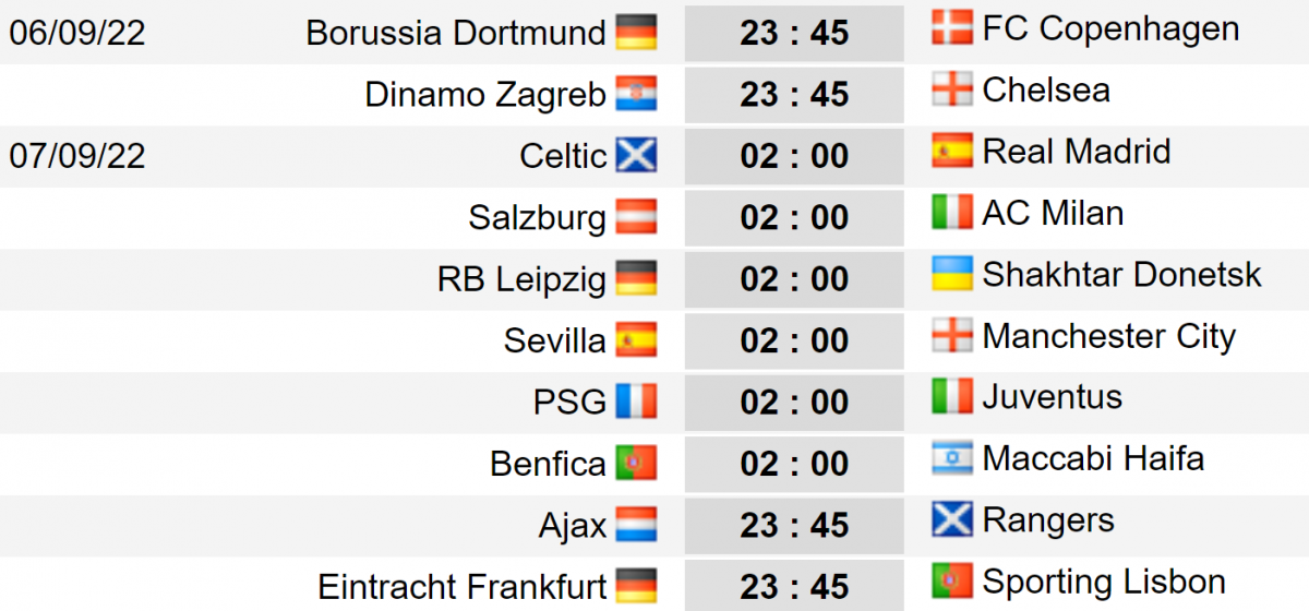Lịch thi đấu lượt trận đầu tiên vòng bảng Cúp C1 châu Âu 2022/2023 hôm nay (6/9).