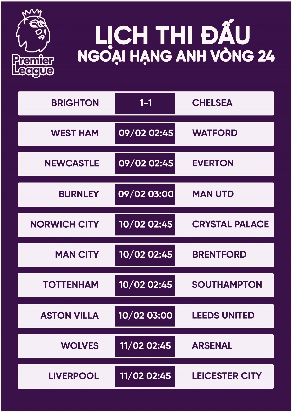 Theo lịch thi đấu bóng đá hôm nay 8/2 và rạng sáng 9/2, người hâm mộ giải Ngoại hạng Anh sẽ được chứng kiến đội bóng yêu thích của mình thi đấu tại vòng 24. Đêm nay, vòng 24 Ngoại hạng Anh sẽ diễn ra 3 trận đấu đáng chú ý.