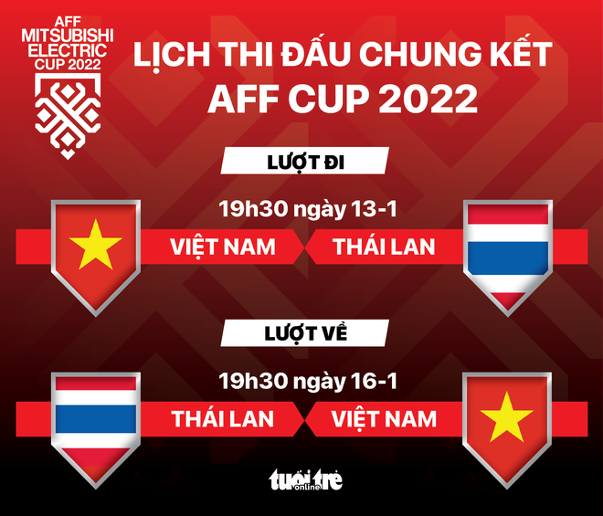 Chung kết lượt đi giữa Thái Lan và Việt Nam diễn ra lúc 19h30 ngày 13-1 trên sân Mỹ Đình. Trận lượt về diễn ra lúc 19h30 ngày 16-1 tại Thammasat.