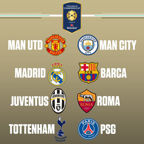 | Lịch thi đấu ICC 2017 19/7: PSG vs Roma (địa điểm chưa xác định) 20/7: Man Utd vs Man City (địa điểm chưa xác định) 22/7: Barcelona vs Juventus (East Rutherford, N.J) 22/7: Tottenham vs PSG (Orlando, Fla.) 23/7: Man Utd vs Real Madrid (Santa Clara, Calif.) 25/7: Tottenham vs Roma (Harrison, N.J.) 26/7: Man Utd vs Barcelona (Landover, Md.) 26/7: PSG vs Juventus (Miami, Fla.) 26/7: Real Madrid vs Man City (Los Angeles, Calif.) 29/7: Man City vs Tottenham (Nashville, Tenn.) 29/7: Real Madrid vs Barcelona (Miami, Fla.) 30/7: Juventus vs Roma (Foxborough, Mass.) |