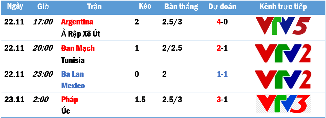 Ở bảng D, trận đấu diễn ra lúc 20 giờ giữa Đan Mạch và Tunisia sẽ không gây chú ý bằng màn xuất quân của tuyển Pháp trong trận gặp tuyển Úc lúc 2 giờ sáng. ĐKVĐ Pháp vắng Benzema vào giờ chót nhưng HLV Deschamp vẫn có trong tay rất nhiều hảo thủ để lựa chọn và trước một đội bóng trung bình khá như tuyển Úc, có lẽ tuyển Pháp sẽ không mất nhiều sức lực để có 3 điểm đầu tay sau trận đấu này./.