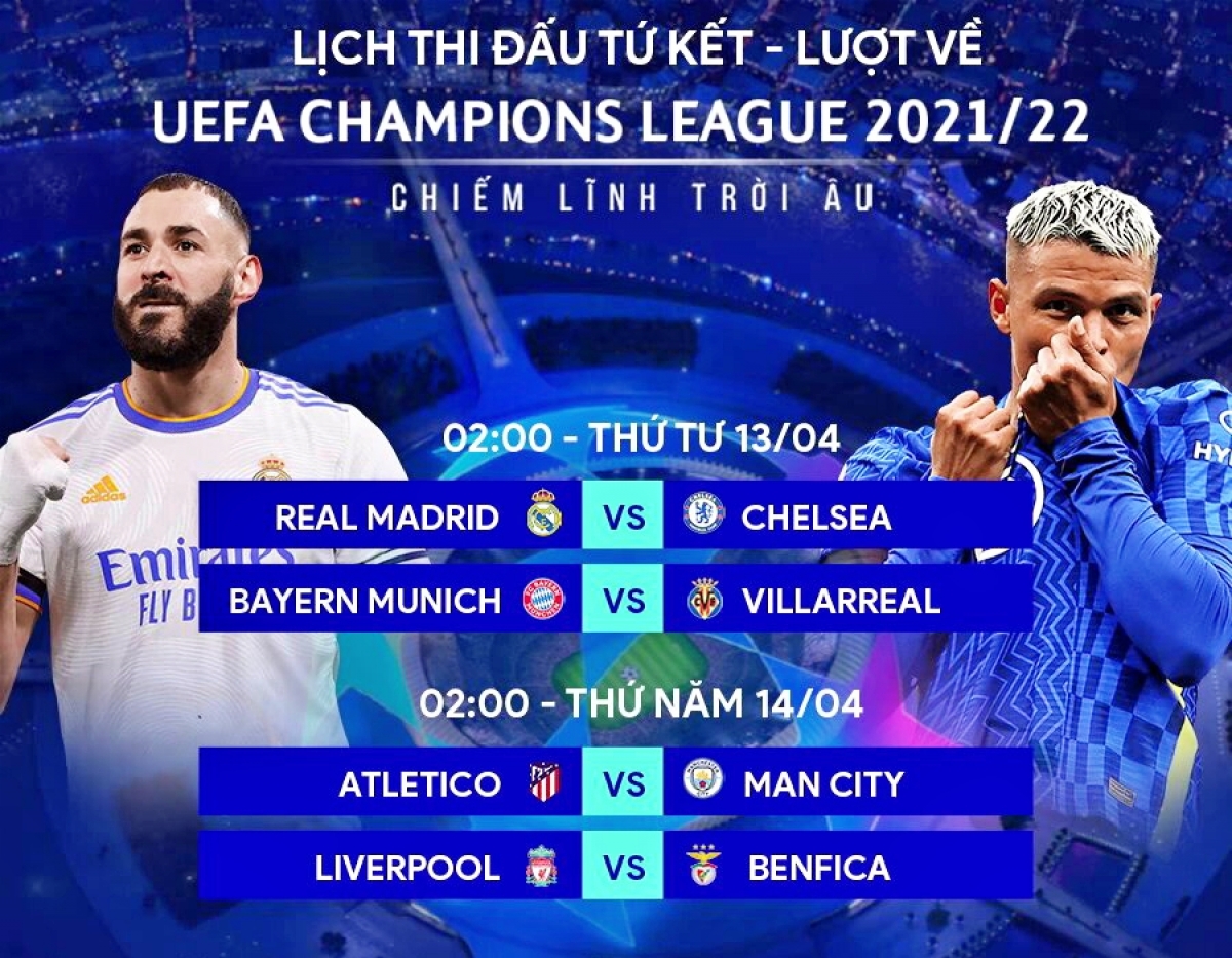 Lịch thi đấu và trực tiếp Cúp C1 châu Âu hôm nay (12/4): Real Madrid so tài Chelsea