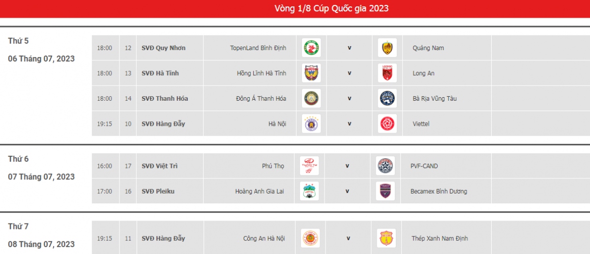 Sau khi giai đoạn lượt đi của V-League 2023 khép lại, các đội bóng sẽ bước vào tranh tài ở đấu trường Cúp Quốc gia 2023. Theo lịch thì vòng 1/8 Cúp Quốc gia 2023 sẽ diễn ra trong các ngày 6,7 và 8/7.