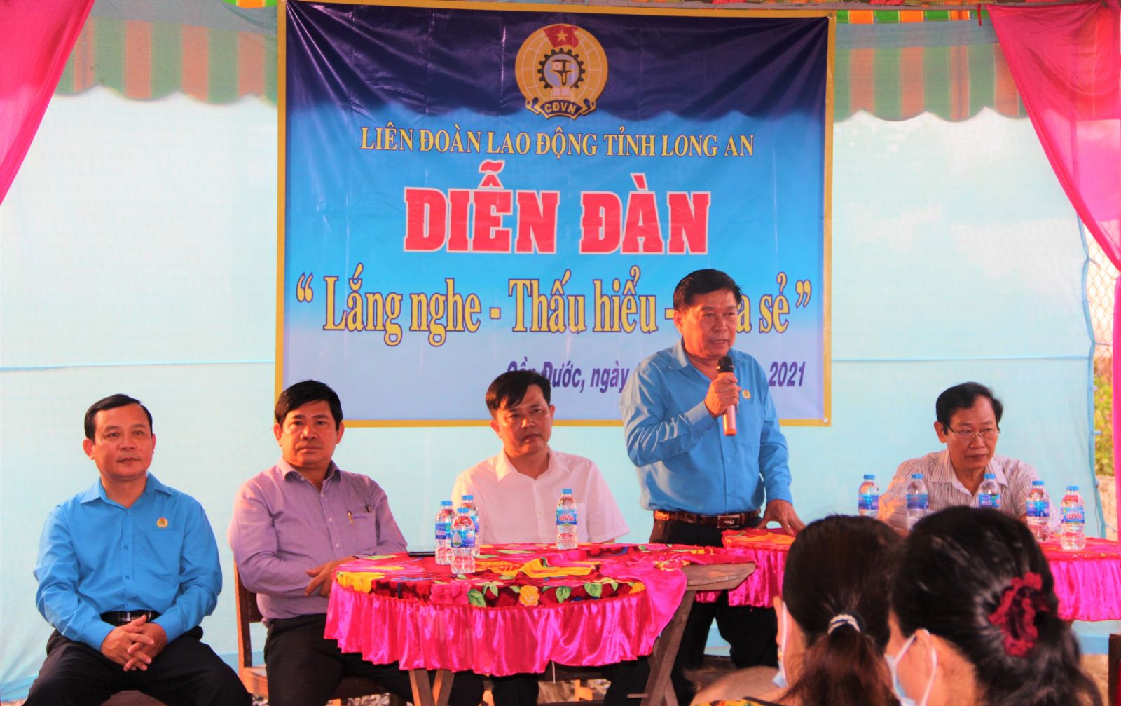Chủ tịch Liên đoàn Lao động tỉnh - Nguyễn Văn Quí cho biết, Diễn đàn “Lắng nghe - Thấu hiểu - Chia sẻ” là nơi để đoàn viên, CNLĐ bày tỏ tâm tư, nguyện vọng, đề xuất kiến nghị với các cấp ủy Đảng, chính quyền, tổ chức CĐ về những vấn đề liên quan trực tiếp đến đời sống, việc làm của CNLĐ. Thông qua diễn đàn còn giúp cho các cấp CĐ nắm bắt được những vấn đề cấp bách, có tác động lớn, phạm vi ảnh hưởng rộng đến đông đảo đoàn viên, CNLĐ; qua đó phối hợp các cấp, các ngành có biện pháp giải quyết phù hợp, hiệu quả.