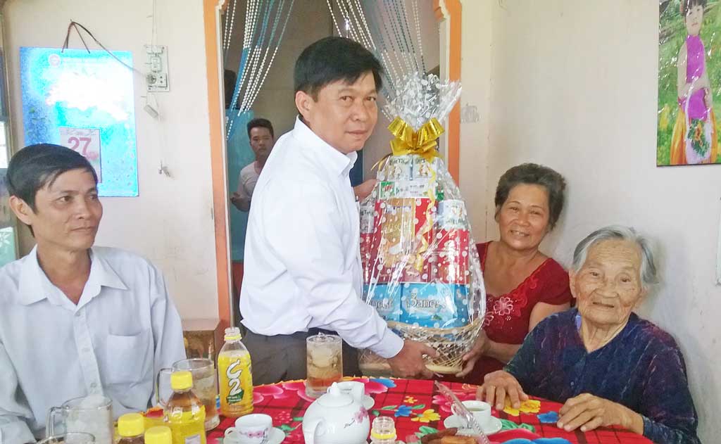 Phó Chủ tịch Liên đoàn Lao động (LĐLĐ) tỉnh - Nguyễn Văn Quí ân cần thăm hỏi sức khỏe của mẹ và vui mừng khi biết gia đình mẹ VNAH Đào Thị Tư cũng như các gia đình chính sách trên địa bàn huyện đều là những gia đình văn hóa, luôn gương mẫu đi đầu trong các phong trào, hoạt động ở địa phương.
