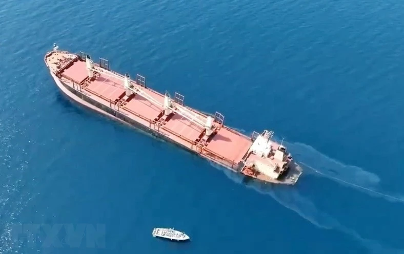 Tàu chở hàng bị lực lượng Houthi tấn công ngày 18/2/2024. (Ảnh: THX/TTXVN)