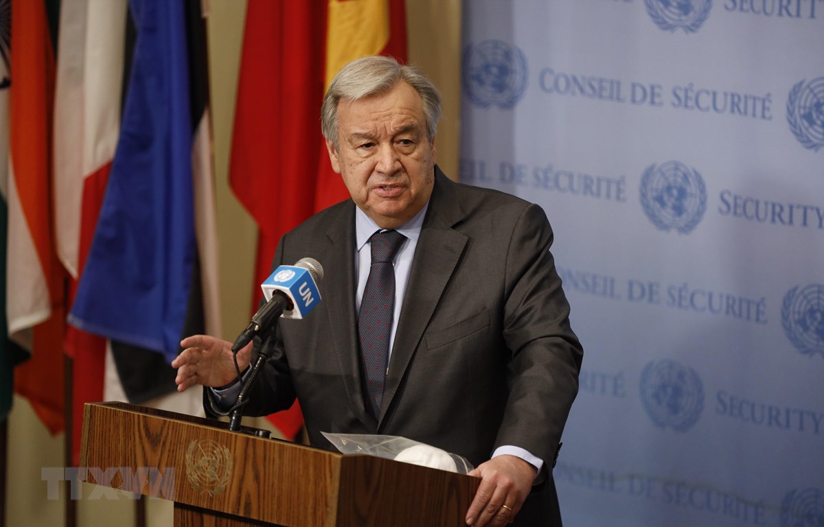 Tổng thư ký LHQ Antonio Guterres phát biểu trong cuộc họp báo tại New York, Mỹ. (Ảnh: THX/TTXVN)