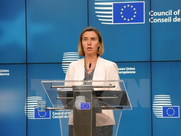 Đại diện cấp cao về chính sách an ninh và đối ngoại của EU, bà Federica Mogherini, phát biểu tại buổi họp báo. (Ảnh: Kim Chung/TTXVN)