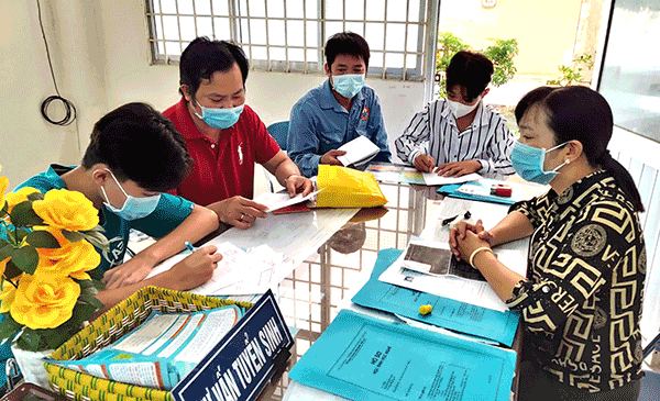 Giáo viên hướng dẫn học sinh làm thủ tục nhập học tại Trường TCN Thới Lai.