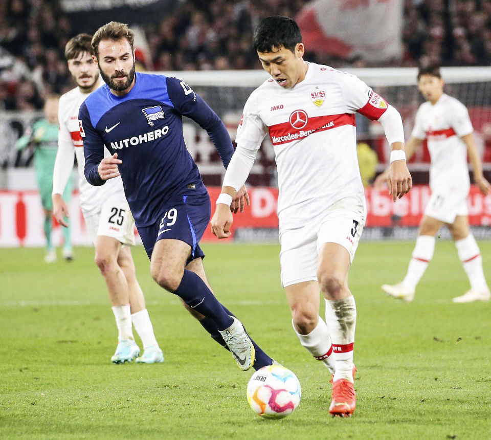 Endo (phải) chạm trán CLB Hertha Berlin mùa rồi. Ảnh: Kyodo News