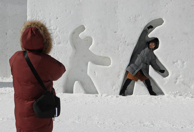 Người hâm mộ chụp ảnh lưu niệm tại một bức tường tuyết ở PyeongChang, Hàn Quốc. - Ảnh: Reuters