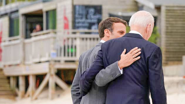 Tổng thống Pháp Emmanuel Macron (trái) và Tổng thống Mỹ Joe Biden tỏ ra thân tình bên lề Hội nghị thượng đỉnh G7 tại Anh hồi tháng 6-2021. Ảnh: Reuters