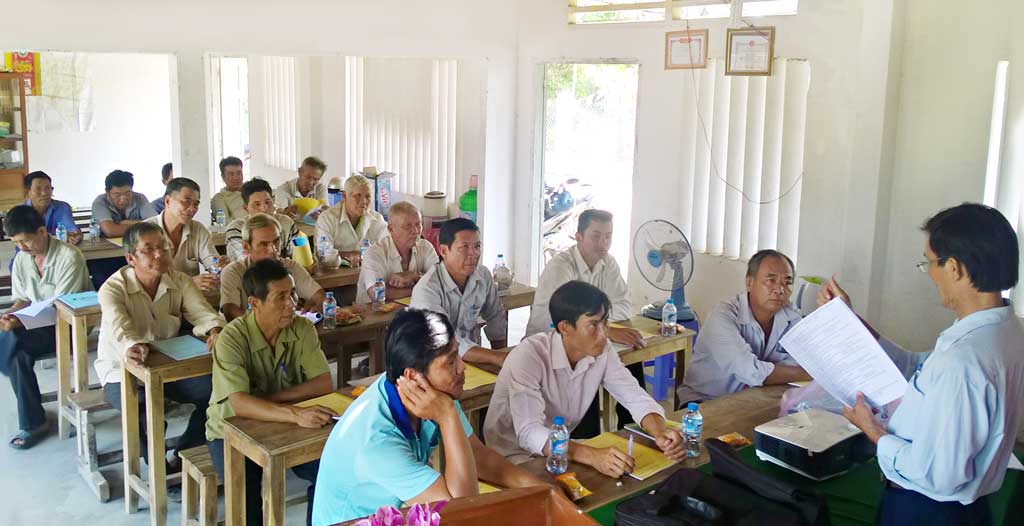 Nông dân xã Bình Hiệp, thị xã Kiến Tường tham gia lớp tập huấn quy trình “3 giảm, 3 tăng” vụ Hè Thu 2018. (Ảnh: BQL Dự án VnSAT Long An)