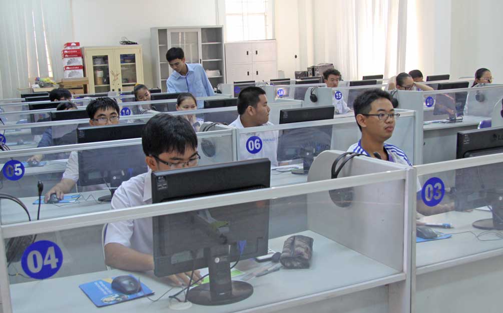 Thí sinh Long An tham gia thi giải Toán trên Internet cấp toàn quốc. Ảnh Ngọc Sương