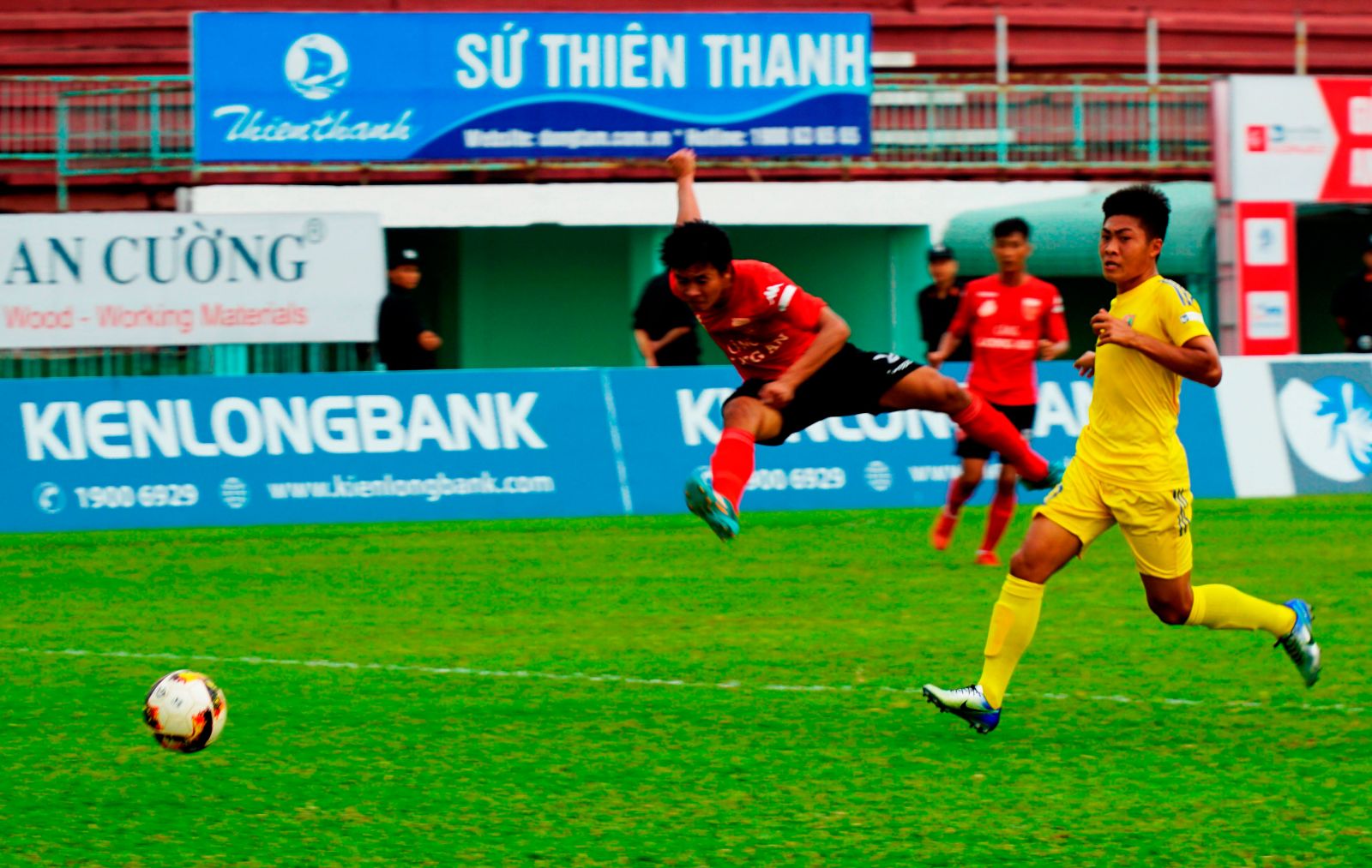 Một pha tấn công dũng mãnh của Phan Tấn Tài (áo đỏ) nhưng cú sút của tiền đạo số 24 không thành bàn