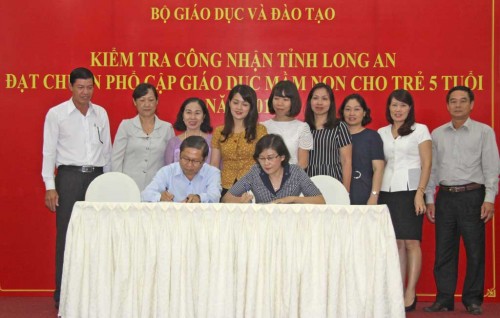 Phó Vụ trưởng Vụ Giáo dục Mầm non Bộ Giáo dục và Đào tạo - Nguyễn Thị Hiếu và Phó Chủ tịch UBND tỉnh - Lê Tấn Dũng ký kết biên bản kiểm tra công nhận phổ cập giáo dục mầm non trẻ 5 tuổi tại tỉnh Long An.