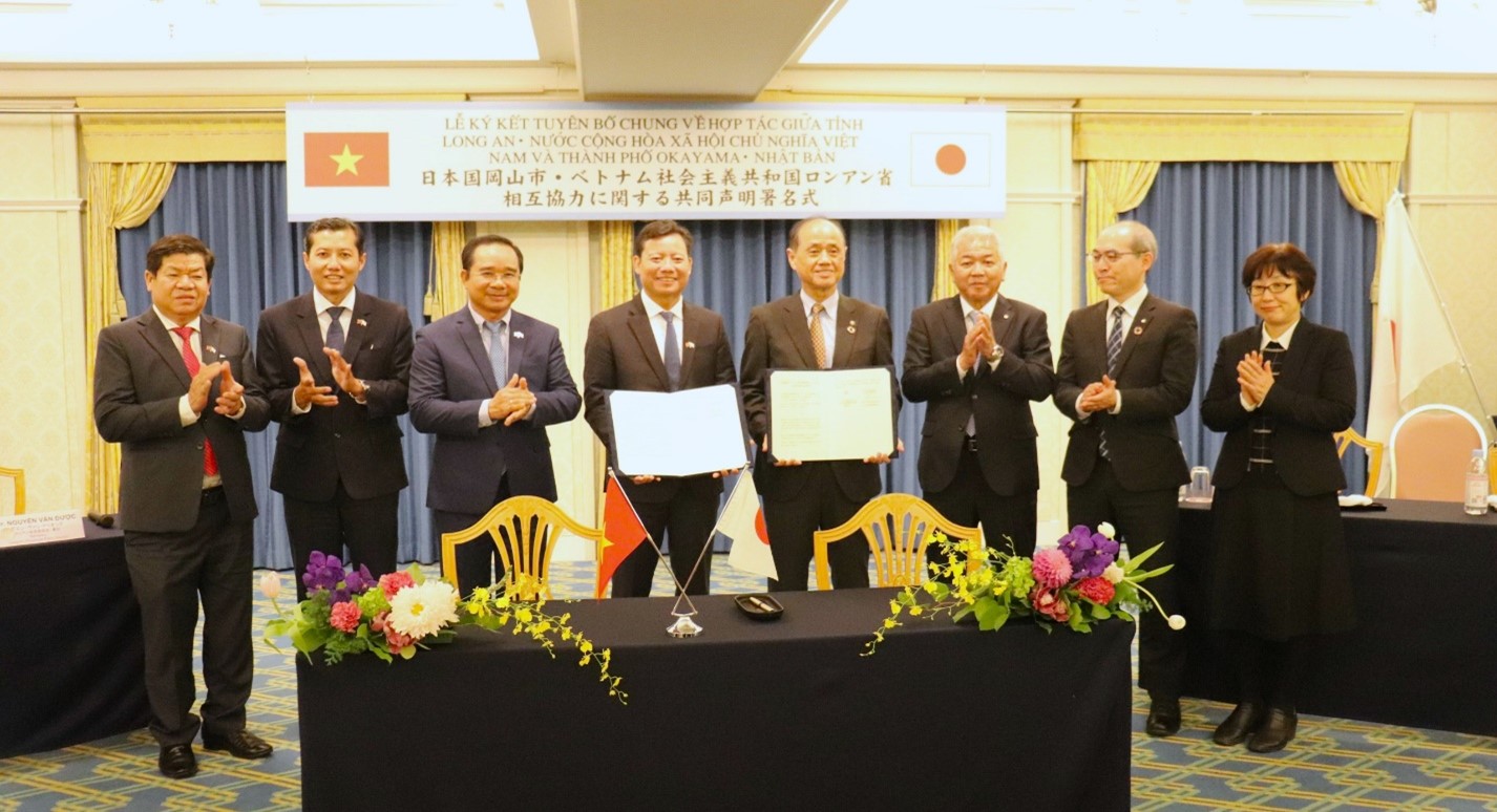 Ngày 05/12/2023, Đoàn công tác của tỉnh Long An tham dự chương trình Hội đàm với Chính quyền Thành phố Okayama (Nhật Bản). Tiếp đoàn có Ông Masao Omori - Thị trưởng thành phố và Ông Taguchi Iroshi - Chủ tịch Hội đồng thành phố Okayama. Hai bên đã trao đổi, giới thiệu về tình hình kinh tế - xã hội của tỉnh Long An và thành phố Okayama; thảo luận về các nội dung hợp tác trong thời gian tới. Cũng trong buổi làm việc này, Ông Phạm Tấn Hòa - Phó Chủ tịch Ủy ban Nhân dân tỉnh Long An và Ông Masao Omori, Thị trưởng Thành phố Okayama đã ký kết Tuyên bố chung về thúc đẩy hợp tác trong lĩnh vực đào tạo nghề, giới thiệu việc làm cho lao động Việt Nam sang làm việc tại Nhật Bản thuộc các lĩnh vực sản xuất công nghiệp, nông nghiệp, thương mại, đầu tư, du lịch, giao lưu văn hóa, nghệ thuật, giáo dục, đào tạo,...