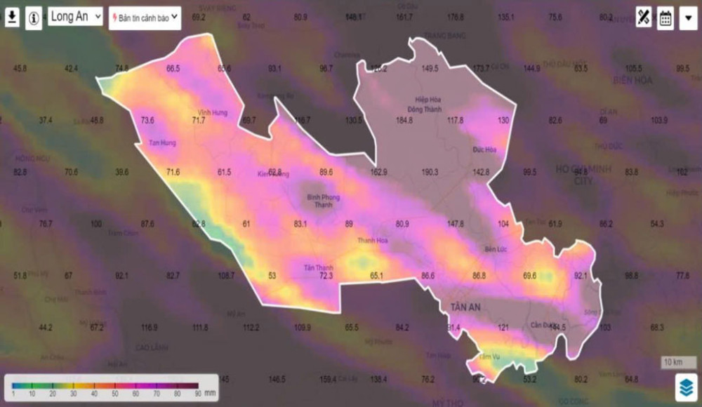 Dự báo trong 24 đến 48 giờ tới, trên địa bàn tỉnh có mưa diện rộng, có nơi mưa vừa, mưa to và giông, cục bộ có mưa rất to. Cụ thể, tại TP.Tân An tổng lượng mưa từ 60-90mm, xác suất từ 75-85%; các huyện phía Bắc tổng lượng mưa từ 70-120mm, xác suất từ 75-85%; các huyện phía Nam tổng lượng mưa từ 50-100mm; xác suất từ 75-85%.