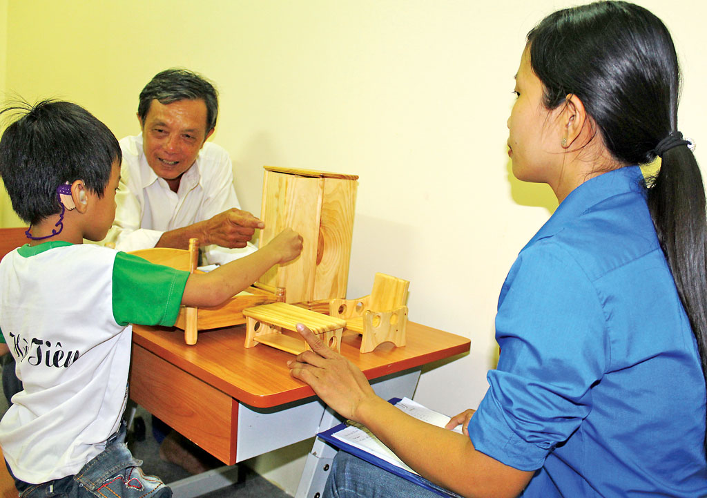 Phụ huynh em Trần Bùi Minh Trí cho biết: “Vợ chồng tôi chỉ có cháu Trí là con trai nhưng lúc cháu 2 tuổi, gia đình mới phát hiện cháu không biết nói, không nghe được và phát triển chậm hơn những đứa trẻ khác. Vì thế, gia đình đưa cháu lên Bệnh viện Nhi đồng, khám và phát hiện cháu bị khiếm thính. Qua tìm hiểu, chúng tôi đưa cháu đến Trường Nuôi dạy trẻ khuyết tật để được can thiệp sớm. Hơn 1 năm kiên trì đến lớp, Trí có nhiều tiến bộ như: Bắt đầu nói được, nghe được và học được cách giao tiếp”.