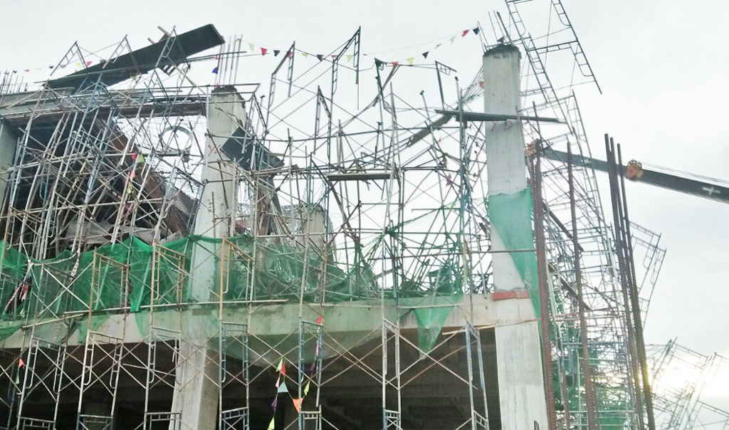 Nhóm công nhân đang đứng làm việc phía dưới cũng bị bê tông ướt, giàn giáo đè lên người.