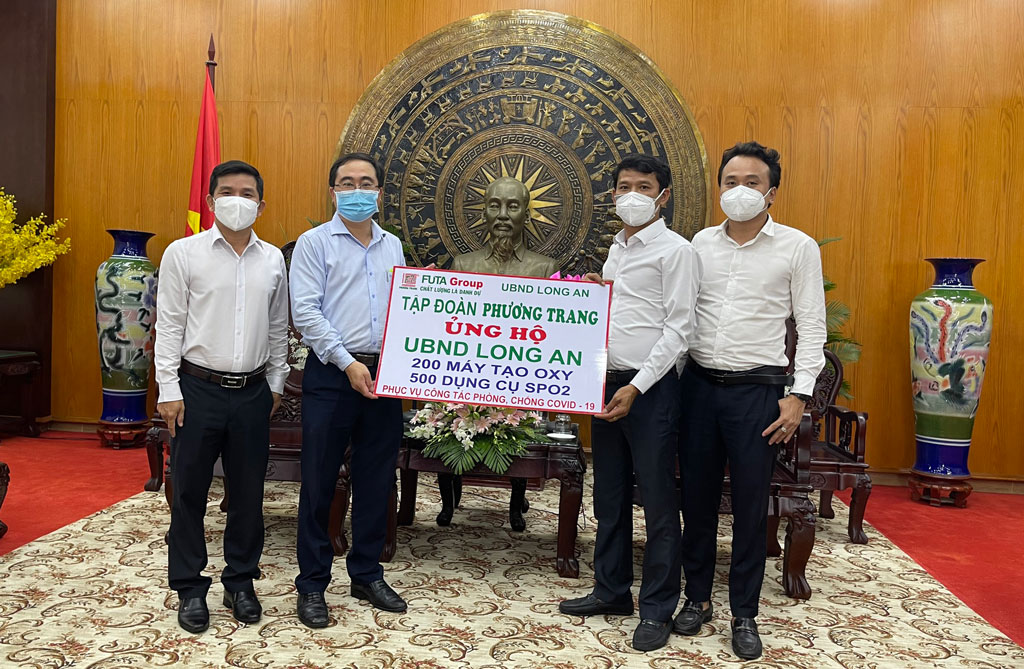 Cùng ngày, Tập đoàn Phương Trang cũng trao tặng tỉnh Long An 200 máy tạo oxy và 500 dụng cụ SPO2 phục vụ công tác phòng, chống dịch Covid-19.
