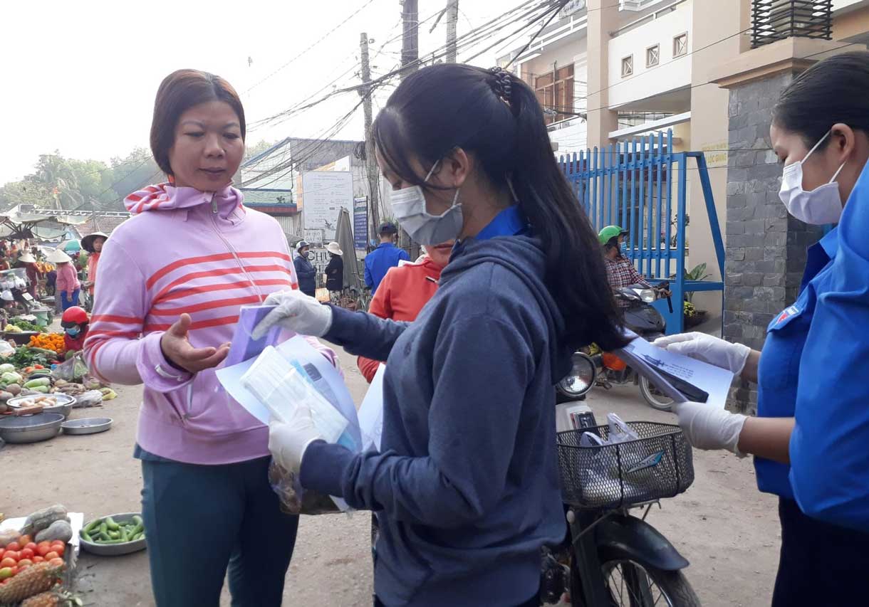 Cán bộ đoàn thể cơ sở cấp phát khẩu trang, tờ rơi tuyên truyền mang khẩu trang và các biện pháp phòng, chống dịch Covid-19