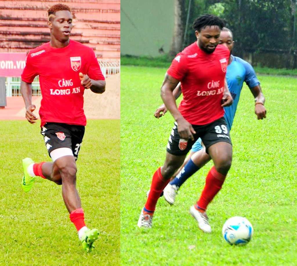 Cặp “song sát” Oseni Bolaji (phải) và Ashkanov Apollon hy vọng sẽ giúp Long An cải thiện sức mạnh trên hàng tấn công. Ảnh: Anh Tuấn