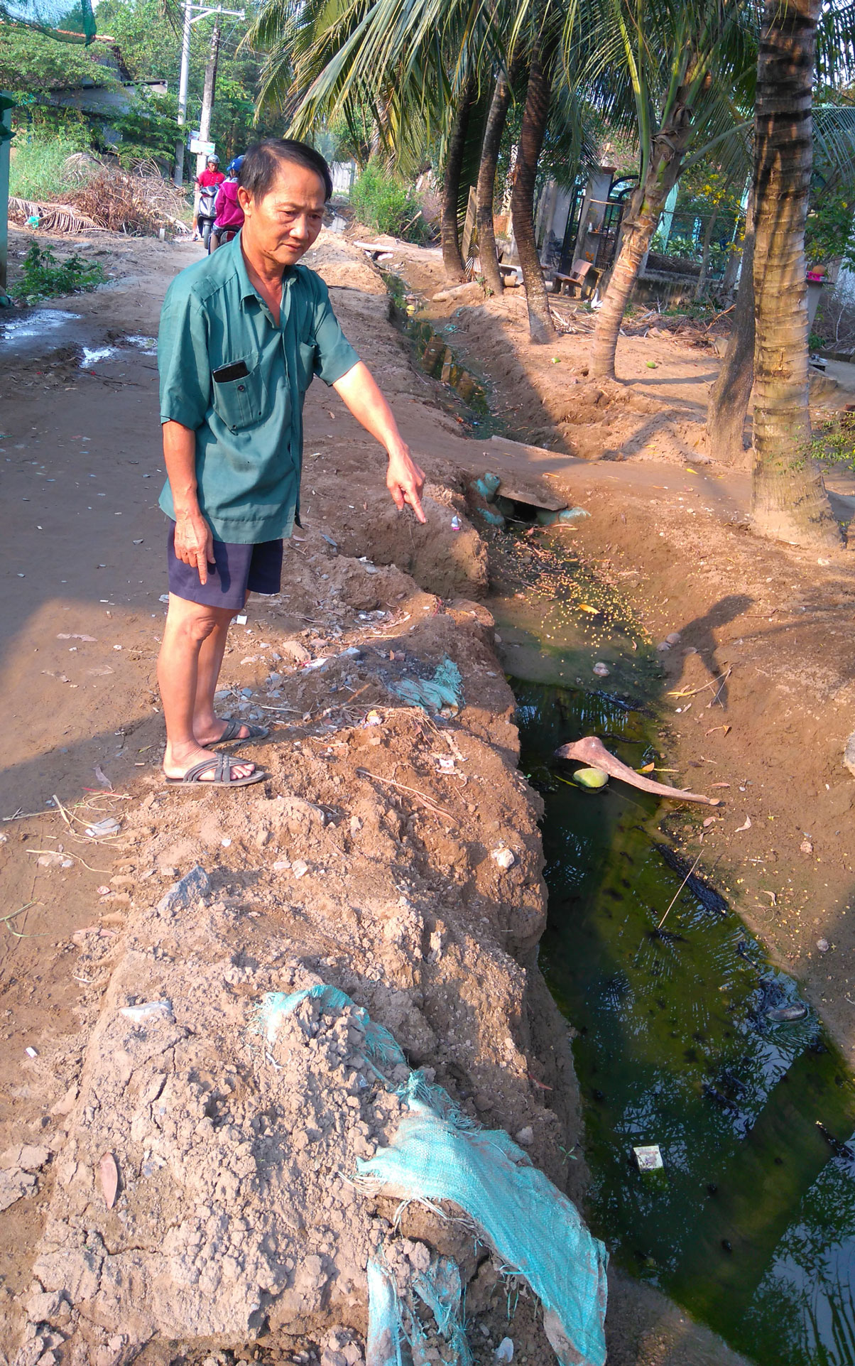 Chú Sáu, một người dân khác cho biết: "Do đơn vị thi công lấp kênh nên đoạn kênh phía bên kia lộ Long Bình bị ứ nước gây ngập nhà, đất vườn của một số hộ dân và nguy cơ gây sạt lở tuyến lộ liên ấp".