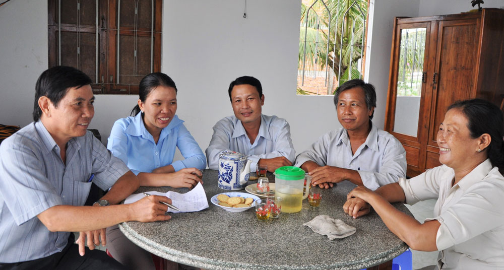 Bí thư Đảng ủy xã Long Hiệp - Trương Ngọc Hiển (bìa trái) cùng đoàn cán bộ xã vận động các nguồn lực xây dựng NTM (trong ảnh: Đến làm việc tại hộ gia đình ông Nguyễn Văn Xuân, ấp Phước Toàn)