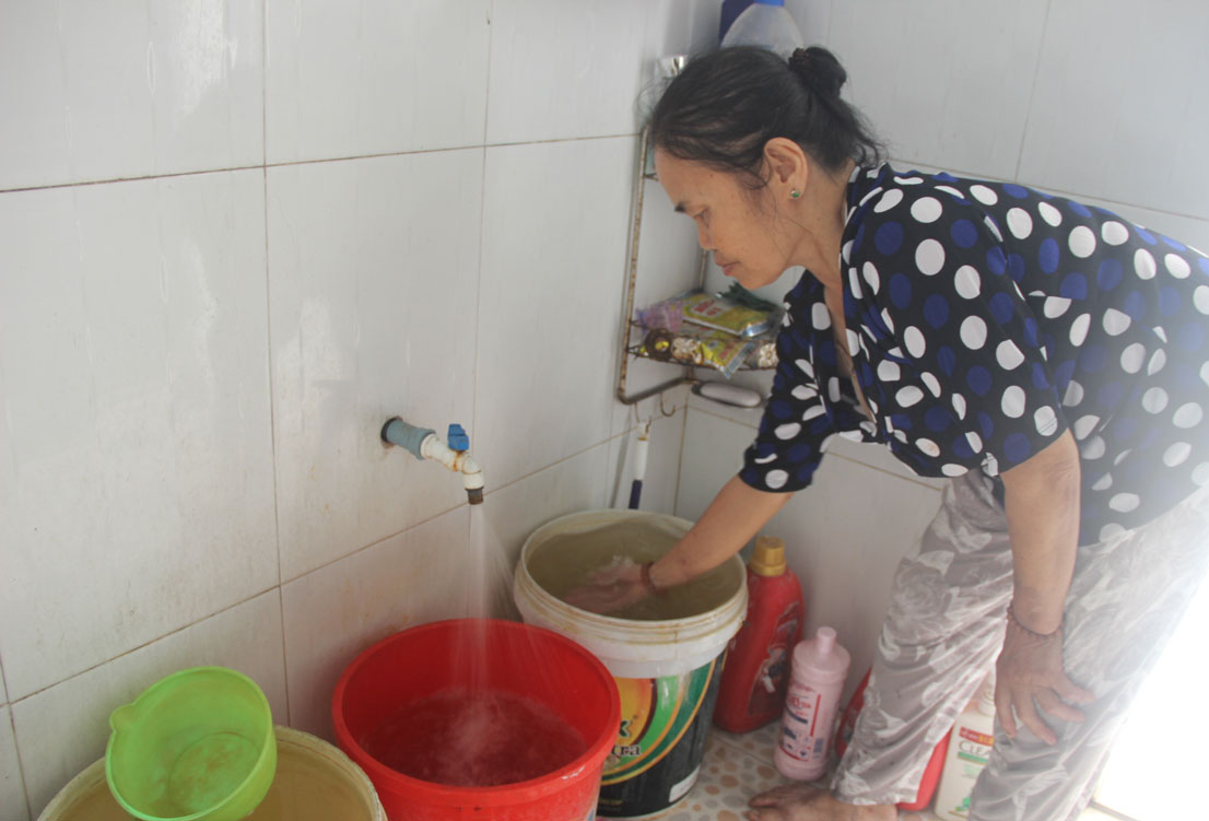 Cách nhà ông Thu chừng 100m, hồ nước nhà bà Nguyễn Thị Vị cũng chung tình cảnh. Bà Vị lo lắng: “Trước đây, nước gia đình tôi sử dụng không bị phèn và hôi mùi bùn. Hơn 1 tháng nay, nước đục ngầu, có mùi bùn non, rất khó chịu khi sử dụng. Nhiều lần, chúng tôi phản ánh đến chính quyền địa phương và quản lý cây nước nhưng vẫn chưa khắc phục được tình trạng này. Hàng ngày, chúng tôi phải "bấm bụng" sử dụng nước để tắm gội chứ cũng không dám nấu ăn”.