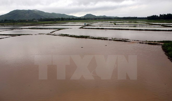 Những thửa ruộng lúa vừa gieo sạ của nông dân huyện Hoài Ân vẫn còn bị ngập trong nước lũ. (Ảnh: Trần Lê Lâm/TTXVN)