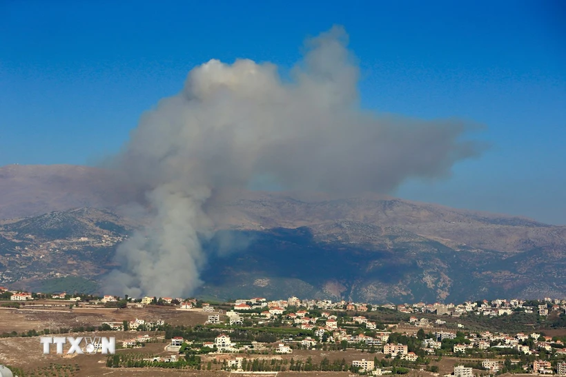 Khói bốc lên sau cuộc không kích của Israel xuống khu vực giữa Rachaya al Foukhar và Kfarhamam, Liban ngày 09/8/2024. (Ảnh: THX/TTXVN)
