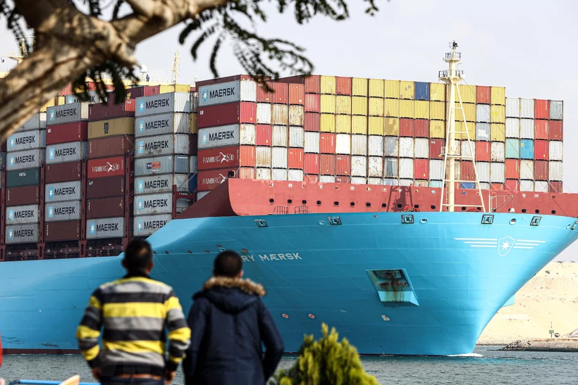 Tàu chở hàng di chuyển qua kênh đào Suez ở tỉnh Ismailia, Ai Cập ngày 13/1/2024. (Ảnh: THX/TTXVN)