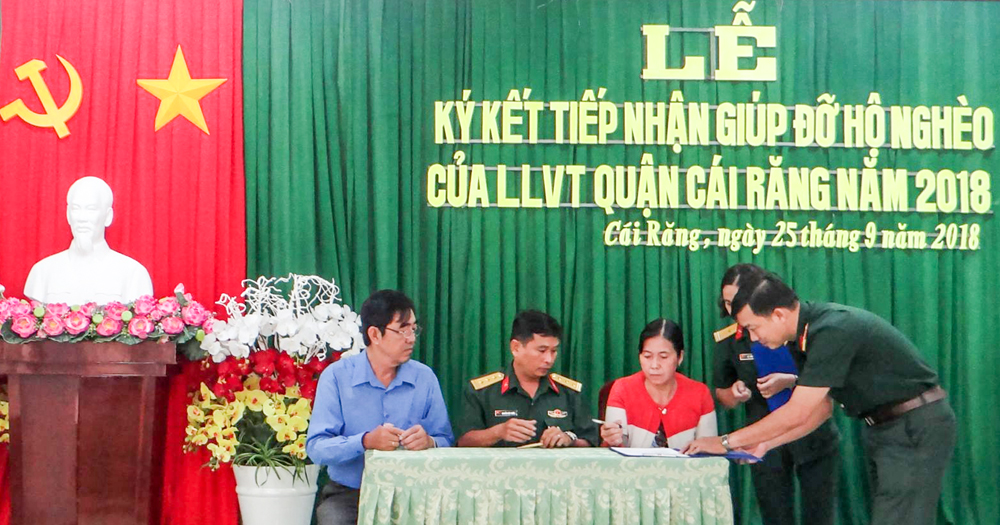 (CT) - Ngày 25-9-2018, lực lượng vũ trang quận Cái Răng tổ chức Lễ ký kết tiếp nhận giúp đỡ 8 hộ nghèo. Trong đó, Ban Chỉ huy Quân sự (CHQS) quận nhận giúp đỡ gia đình bà Nguyễn Thị Hằng (khu vực Thạnh Phú, phường Phú Thứ). Ban CHQS quận sẽ hỗ trợ bà Hằng 10 triệu đồng để buôn bán nhỏ. 7 hộ nghèo còn lại sẽ được 7 Ban CHQS phường giúp đỡ. Đơn vị phấn đấu đến năm 2020 sẽ giúp các hộ thoát nghèo.