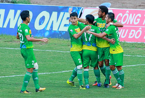 Các cầu thủ Cần Thơ mừng bàn thắng tỷ số của Luiz (thứ 2 từ phải qua).