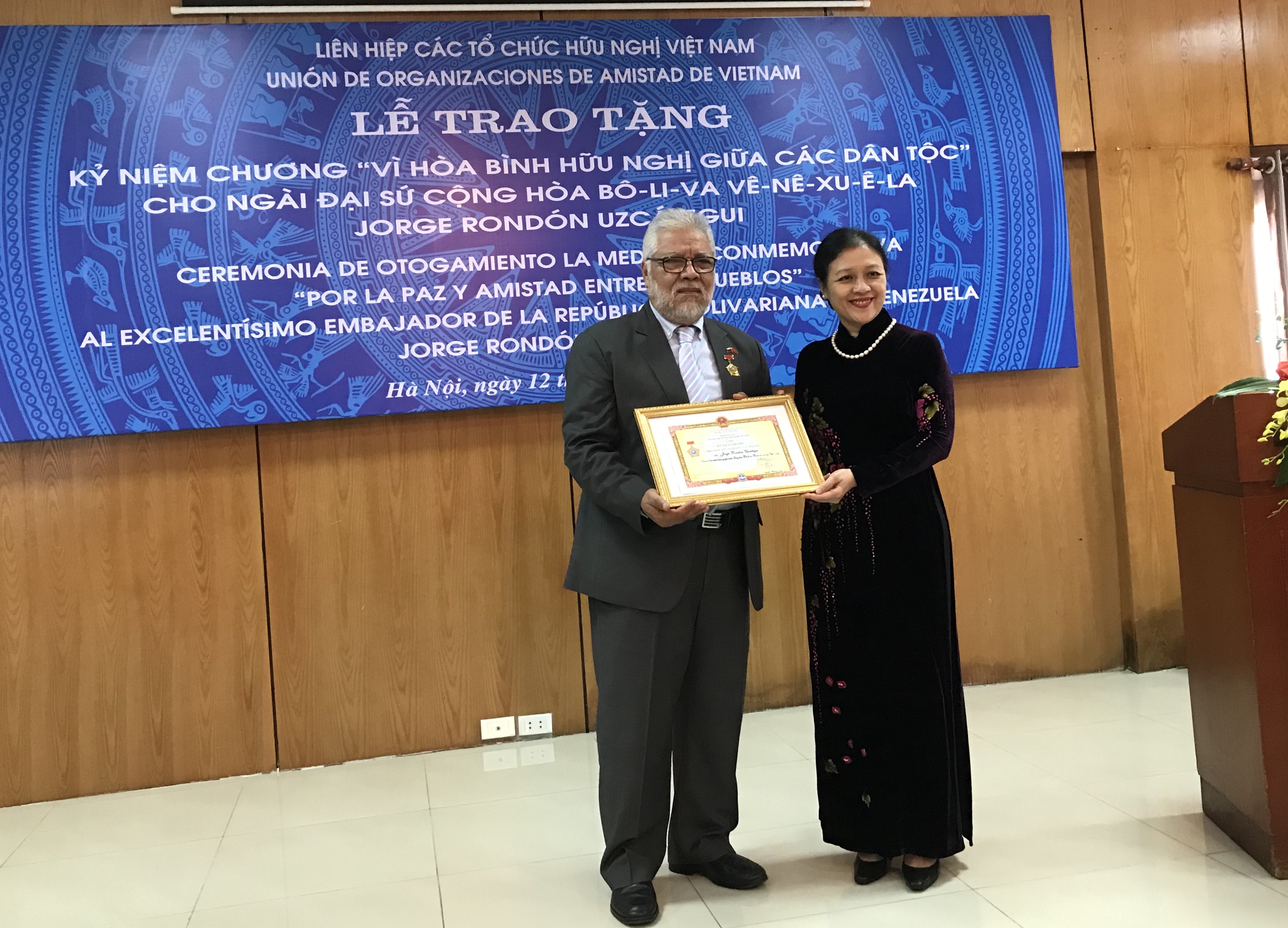 Thay mặt Đoàn Chủ tịch Liên hiệp các tổ chức hữu nghị Việt Nam, Chủ tịch Nguyễn Phương Nga trao Kỷ niệm chương “Vì hòa bình, hữu nghị giữa các dân tộc” tặng Đại sứ Jorge Rondon Uzcategui. Phần thưởng này ghi nhận và tôn vinh những đóng góp quý báu của Ngài Đại sứ trong việc củng cố và tăng cường sự hiểu biết lẫn nhau, quan hệ hữu nghị, đoàn kết và hợp tác giữa nhân dân hai nước Việt Nam và Venezuela.