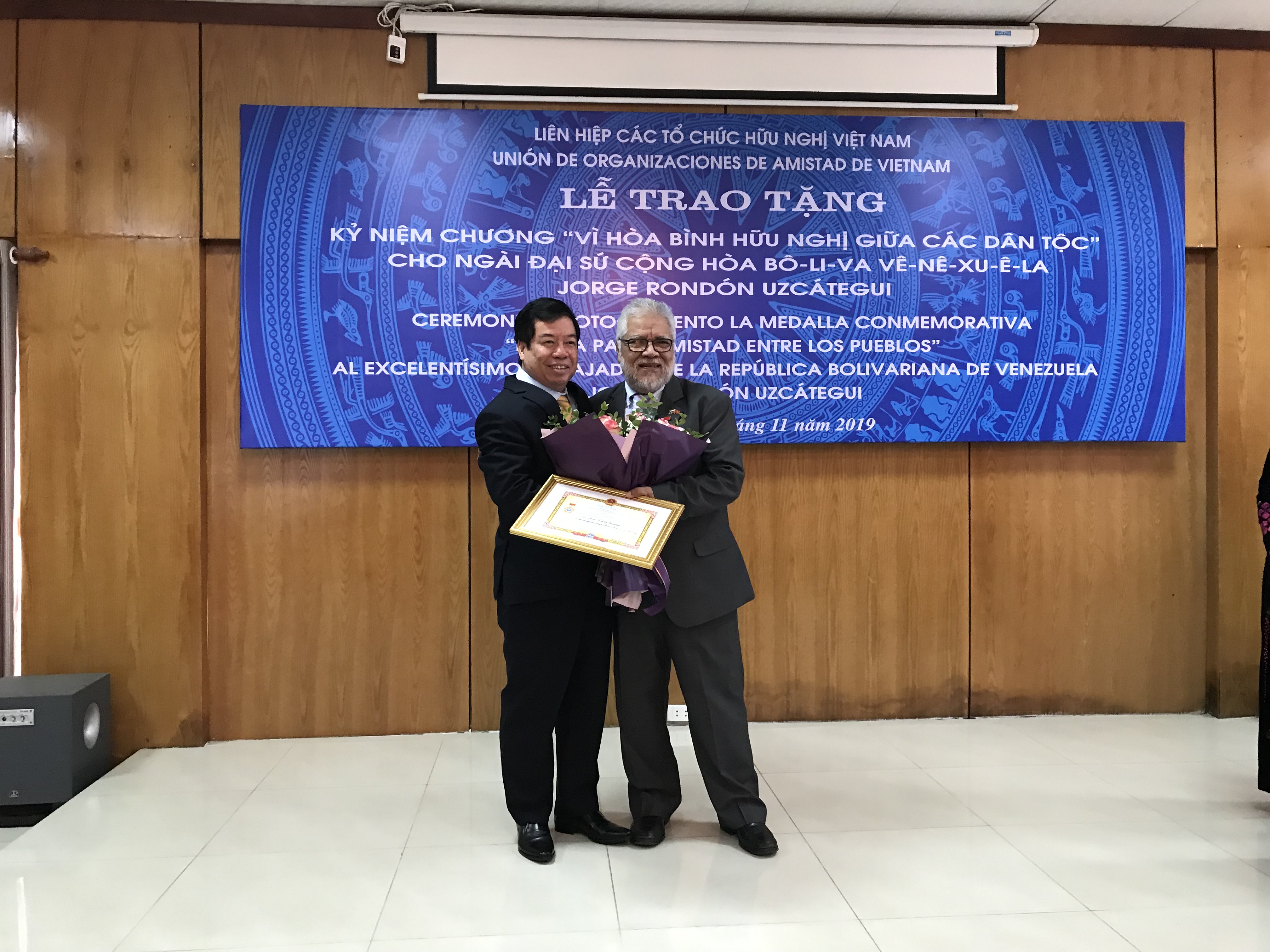 Ngày 12/11, tại Hà Nội, Liên hiệp các tổ chức hữu nghị Việt Nam tổ chức Lễ trao tặng Kỷ niệm chương “Vì hòa bình, hữu nghị giữa các dân tộc” cho Đại sứ đặc mệnh toàn quyền nước Cộng hòa Venezuela tại Việt Nam Jorge Rondon Uzcategui nhân dịp Đại sứ kết thúc nhiệm kỳ công tác tại Việt Nam.