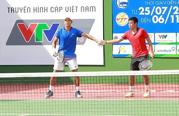 Hoàng Nam (áo đỏ) và Ti Chen giành quyền vào tứ kết đôi nam Giải Vietnam F9 Futures. Ảnh Anh Vũ