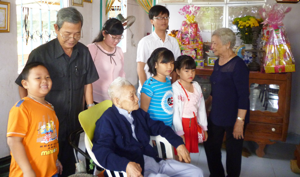 Ông Ba Phong (áo đen, đứng) và những người trong gia đình ông đang chúc tết và mừng thọ má Hai