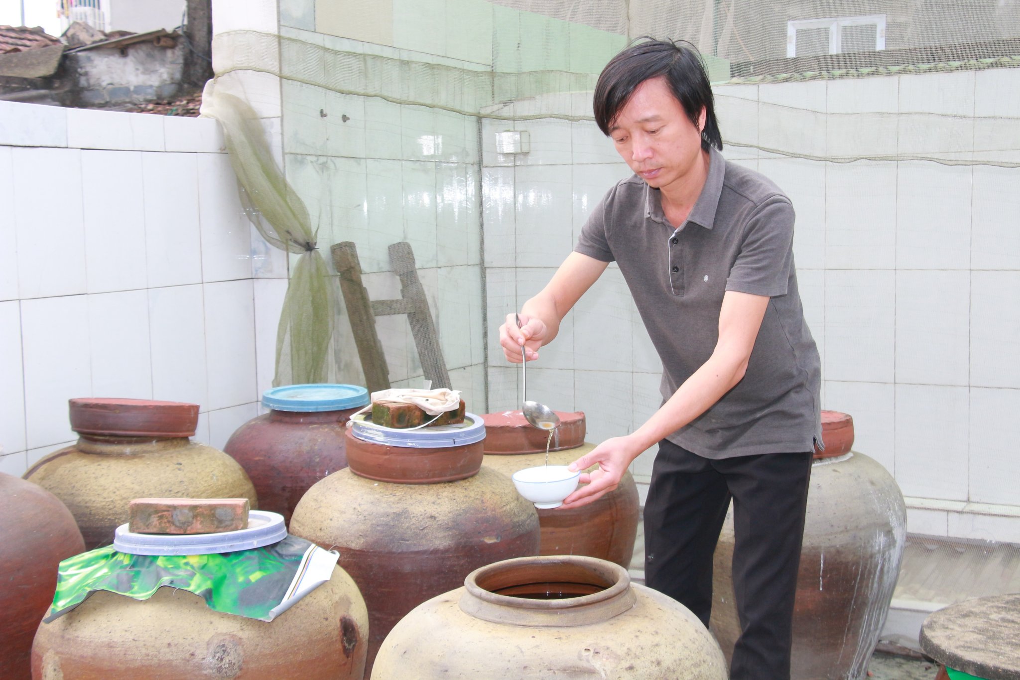 “Để chiết ra được những giọt nước mắm cốt tinh khiết, chất lượng nhất thì ngoài việc trộn cá và muối với tỉ lệ 3:1 thì công đoạn ủ chượp là khâu quan trọng. Thời gian ủ chượp kéo dài từ 18 - 24 tháng. Tuy nhiên, ủ chượp càng lâu thì chất lượng nước mắm càng thơm, ngon; màu sắc càng hút mắt”, anh Phúc cho hay.