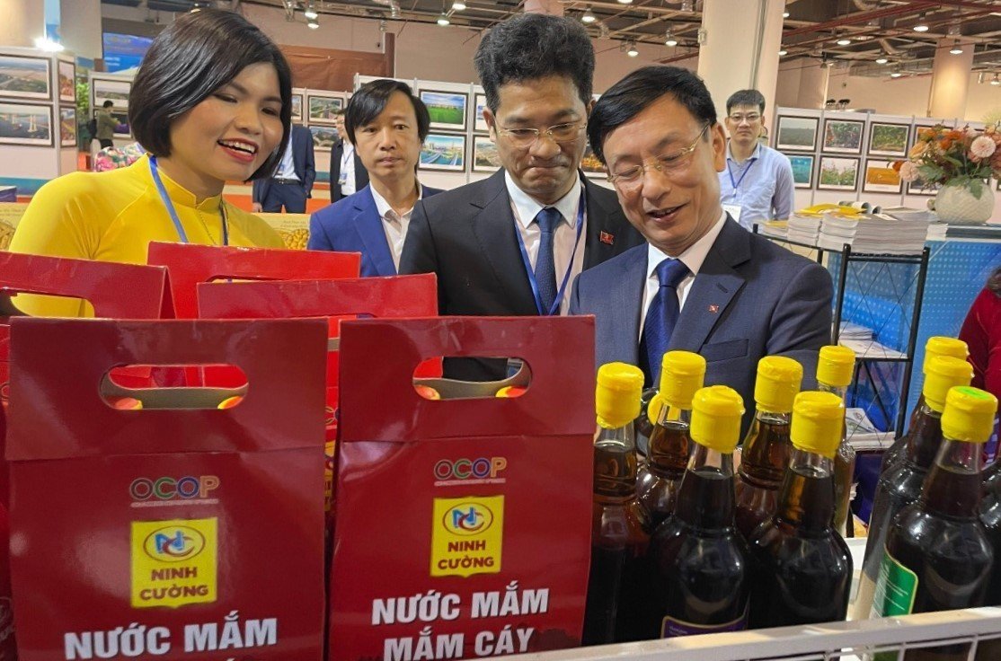 | Đại biểu và khách hàng tham quan gian hàng trưng bày sản phẩm nước mắm và mắm cáy Ninh Cường tại 1 sự kiện quảng bá mới diễn ra ở tỉnh Quảng Ninh. (Ảnh: Chủ cơ sở cung cấp) |
