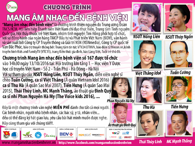 Với thông điệp hãy để tấm lòng thiện nguyện được chia sẻ, hãy để những giai điệu yêu thương lan tỏa mạnh mẽ, sức mạnh của âm nhạc sẽ làm vơi đi những lo âu, mệt mỏi, đem lại cho bệnh nhân niềm vui, niềm tin vào cuộc sống, chương trình Mang âm nhạc đến bệnh viện số 167 sẽ là một bữa tiệc âm nhạc đa dạng, hấp dẫn và ý nghĩa.