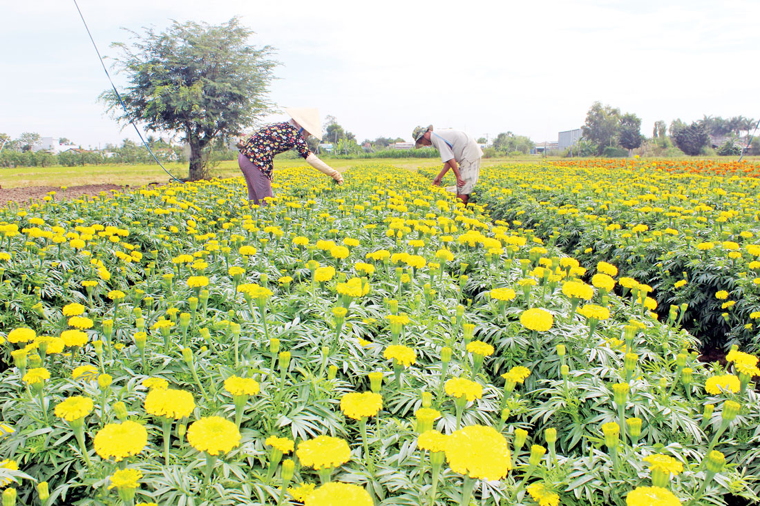 Không phải là vùng chuyên canh trồng hoa phục vụ thị trường tết nhưng những năm trở lại đây, nghề trồng hoa mang lại thu nhập cao cho người dân các huyện vùng Đồng Tháp Mười: Tân Hưng, Mộc Hóa, Vĩnh Hưng,... Bà Trần Thị Thúy Hằng (xã Vĩnh Đại, huyện Tân Hưng) bộc bạch: “Gia đình tôi sống chủ yếu bằng nghề làm thuê, thu nhập rất bấp bênh. Mấy năm nay, nhờ tận dụng đất vườn, gia đình tôi trồng hoa vạn thọ bán tết. Năm rồi, gia đình trồng 1.200 chậu hoa vạn thọ, sau khi trừ chi phí, lãi trên 20 triệu đồng. Năm nay, gia đình tôi tiếp tục trồng 6.000 chậu hoa vạn thọ. Hy vọng sẽ có một mùa bội thu để ăn tết lớn”.