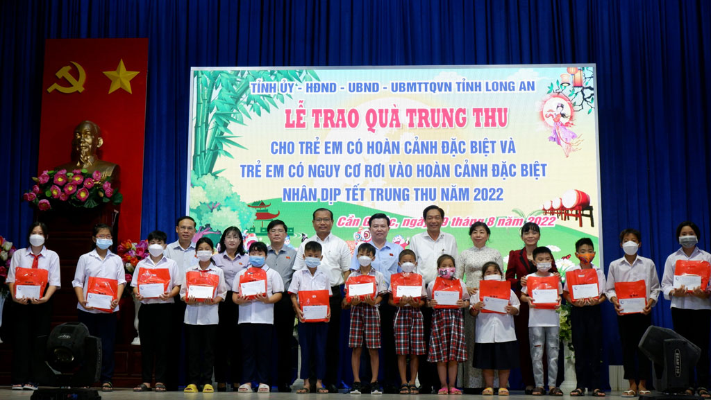 Cụ thể, Tết Trung thu năm 2022, Sở Lao động - Thương binh và Xã hội (LĐ-TB&XH) tham mưu UBND tỉnh Long An tặng 4.200 phần quà trung thu cho trẻ em có hoàn cảnh đặc biệt và có nguy cơ rơi vào hoàn cảnh đặc biệt trên địa bàn tỉnh. Mỗi phần quà trị giá 500.000 đồng, gồm bánh trung thu và 400.000 đồng; nguồn kinh phí được trích từ Quỹ Bảo trợ trẻ em tỉnh do ngân sách cấp.